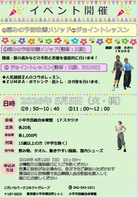 小平市民総合体育館の次回休館日は、4/6(月)、5/7(木)となります。