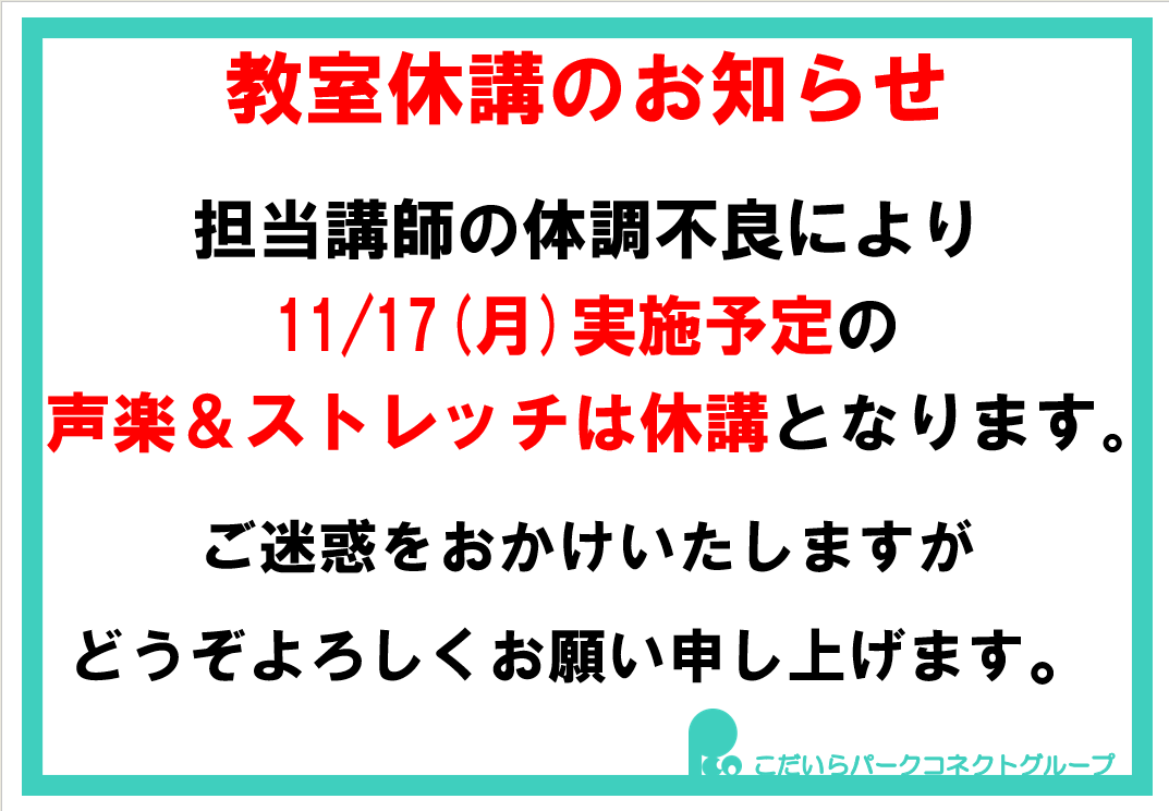 11/17(月)声楽&ストレッチ休講のお知らせ