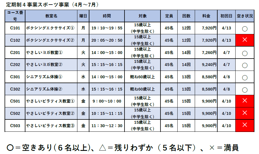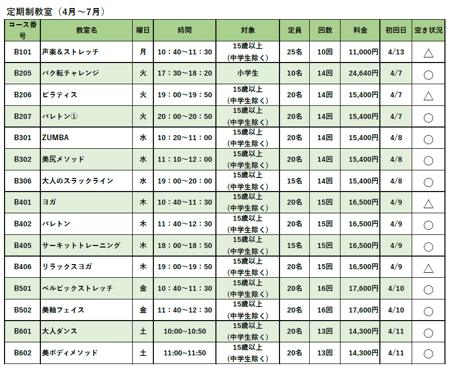 最新空き状況掲載 4月スタート教室申込みのご案内